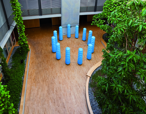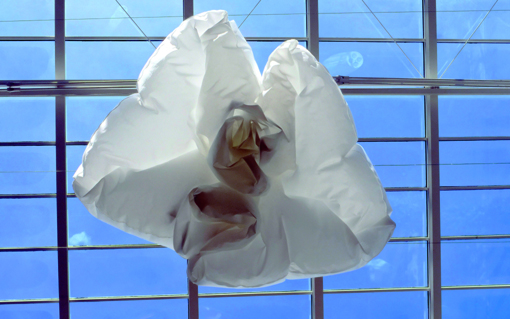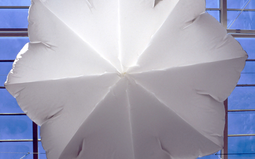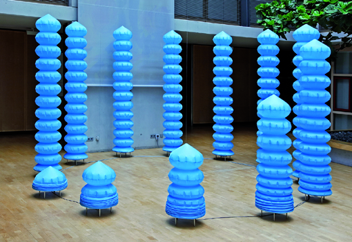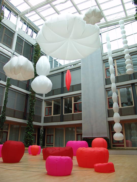 Wer das Haus durch den Haupteingang betritt, wird von zwölf Objekten aus halbtransparenter blauer Ballonseide empfangen, die, teils gleichzeitig, teils versetzt , in unterschiedlicher Geschwindigkeit nach oben wachsen und sich wieder in sich zusammenziehen. Während die anderen im Foyer des Hauses herumlümmelnden Objekte eher Individuen darstellen, scheinen sich hier zwölf Objekte zum Rudel zusammengeschlossen zu haben. Flower Power rules! Diese verschworene Gruppe scheint sich bewusst von den im Atrium wachsenden Grünpflanzen distanziert zu haben, scheint ihr eigenes „Ding“ durchzuziehen. Aufgrund der größeren Strenge – sowohl die eigene Form, als auch die gemeinsame Anordnung betreffend – wirkt diese Gruppe starrer, disziplinierter, ernster als der Rest der Exponate.