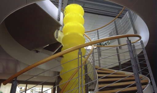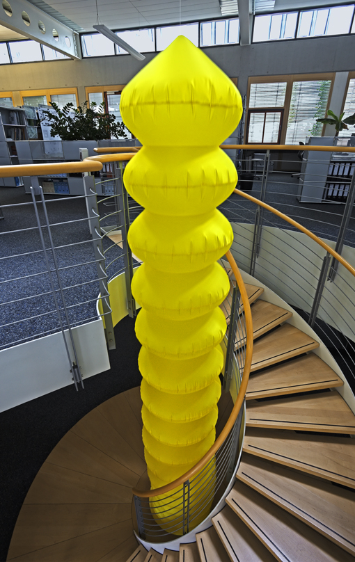 Die Objekte suchen und finden den Dialog zur umgebenden Architektur und zum Betrachter. So scheinen die runden Objekte längst den Kontakt zur Wendeltreppe aufgenommen zu haben, während die blauen, pulsierenden Objekte den benachbarten, in Lethargie verharrenden Grünpflanzen ein „Ätschebätsch“ entgegen zu schmettern scheinen.