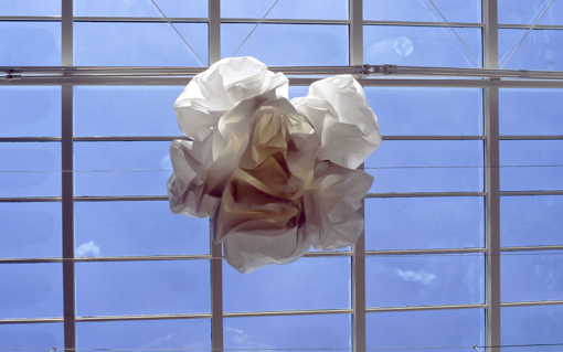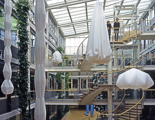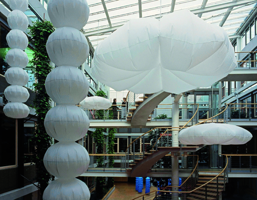 Die künstlichen, vom Luftzug im Raum zusätzlich bewegten Wolkenobjekte treten in eine reizvolle Wechselbeziehung zu den realen, durch das Glasdach sichtbaren Wolken und beeinflussen wie ihre „Schwestern“ und „Brüder“ die Lichtverhältnisse im Atrium, indem sie das hereinströmende Licht mal mehr, mal weniger verdecken oder durchlassen.