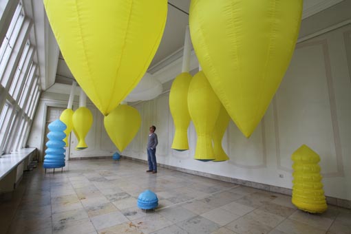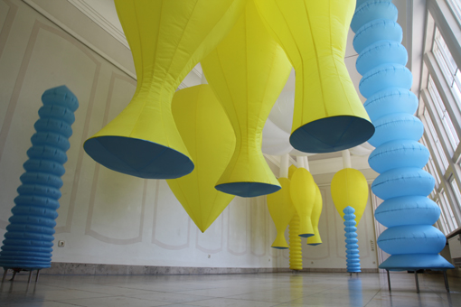 Von einer ganz anderen Art ist da die Installation des Künstlerpaars Bettina Bürkle und Klaus Illi, die hier im „Raum für Pflanzen“ zu sehen ist. Zwar geht es auch in ihr, das läßt, wie gesagt, der Name des Ausstellungsorts und die mit ihm verbundene Konzeption bereits vermuten, um Pflanzliches, doch sind vergleichbare Täuschungen durch die Objekte wie bei Nancy Graves weder beabsichtigt noch real zu erwarten. Das heißt, wenn bei jener die Irritation darin bestand, daß die von ihr geschaffenen Objekte im wesentlichen unverändert, also lediglich präpariert oder konserviert, der belebten Natur entnommen zu sein schienen, so irritiert hier im Gegenteil, daß die Objekte etwas zu sein vorgeben, was man nur mit einer gewissen Bereitwilligkeit in ihnen entdecken kann. Oder anders: Was in den Kunst-Kamelen einander so nahegebracht wurde, daß es fast untrennbar in eins zusammenzufallen schien, das fällt hier so weit auseinander, daß es letztlich dem Blick und Intellekt des Betrachters überlassen bleibt, zwischen beidem eine Verbindung herzustellen. Denn zunächst, und das von Wahrnehmung zu Wahrnehmung mehr, fallen die Differenzen ins Auge. Allem voran: Es fehlt das Grün, die Pflanzenfarbe schlechthin, die man, wenn es um vegetabiles Leben geht, als dominante erwartet. Mit Blau, Gelb und Weiß, die statt dessen den Raum beherrschen, lassen sich zwar sehr gut Blumen oder Früchte assoziieren, doch paßt zu denen nicht die fehlende farbliche Nuancierung der Objekte, auch sind die Farben selber nicht von der Art, wie man sie etwa von einer Blumenwiese her kennt. Sie leuchten nicht, sie glänzen, ein Umstand, der natürlich vor allem dem mit ihnen eingefärbten Material geschuldet ist, einem industriell gefertigten Ballonstoff, bei dessen Auswahl sicher auch nicht das Bemühen um eine Ähnlichkeit im Vordergrund stand. Und dann schließlich die Form der Objekte: rundlich wie Früchte und Knospen die einen, länglich wie Bäume und Stengel die anderen, doch von einer Ebenmäßigkeit und Symmetrie, wie sie innerhalb der Botanik allein in der vom Menschen geordneten und beschnittenen wie etwa in französischen Gärten vorkommt. Und als letztes noch, die am Boden sich schlängelnden Schnüre zeigen es an: Bei den so sonderbaren Pflanzen handelt es sich um Maschinen.