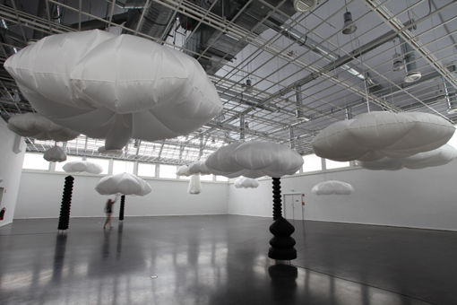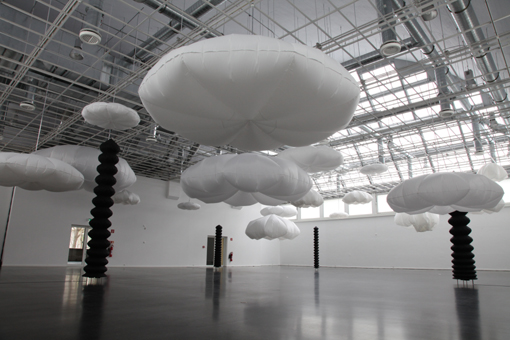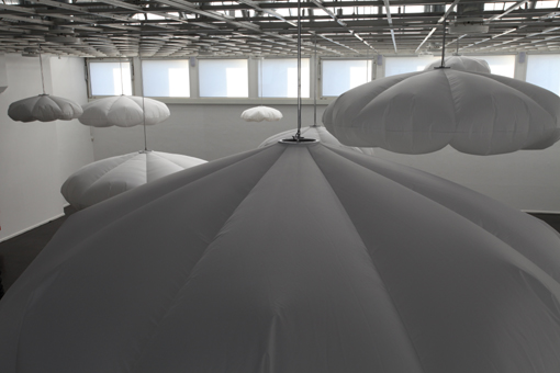 In der 500 qm großen Ausstellungshalle des Kunstvereins Ludwigshafen war vor Jahren das ursprüngliche Glasdach entfernt und dabei die Tragekonstruktion belassen worden. Über dieser Gitterstruktur öffnet sich nun ein Deckengewölbe, eine unzugängliche zweite Raumebene mit einem riesigen,überdimensioniert erscheinenden Röhrensystem, eine Art von „Raumbeatmungsmaschine“, die den Luftaustausch der Halle bewerkstelligt. Auf diesen „Deus ex Machina“ haben sich die Künstler mit der Wolkeninstallation explizit bezogen, die komplexe und visuell sehr präsente Röhrenanlage ist beim Blick auf die atmenden Wolken als Hintergrund präsent und scheint auf den ersten Blick Teil der künstlerischen Installation zu sein. Der Zusammenhang von Kunst und Technik wird hier Thema.