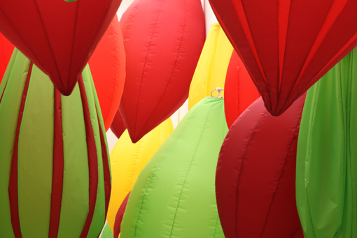 Ventilatoren hauchen den zunächst schlaffen gelben, grünen, roten und rot-grünen