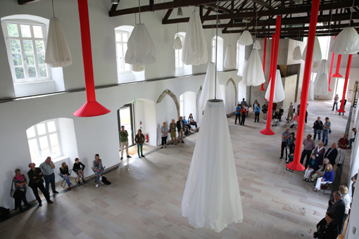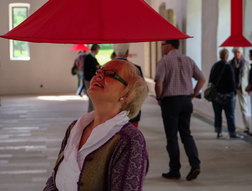 Der atmende Himmel verweist in den historischen Mauern auch auf den klösterlichen Kontext. Während die Wolkenknospen sich beim Atmen in die Horizontale bewegen, betonen die roten, zwischen den Wolken von der Balkendeckenkonstruktion herabhängenden Inspirationsschläuche die Vertikale und stehen damit für die Verbindung von oben und unten. Anders jedoch als die schwarzen Säulen von Ludwigshafen verändern sie ihre äußere Form nicht, sie stehen auch nicht geerdet auf dem Boden. Alle Objekte schweben hier, hängen von oben ab.
