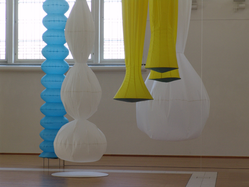 Die hängenden Skulpturen, die Bettina Bürkle und Klaus Illi eigens für die Heidenheimer Ausstellung angefertigt haben, faszinieren aber auch noch aus einem anderen Grund. Denn so große hängende Formen kommen in der Geschichte der Skulptur kaum vor. Zwar hat der amerikanische Künstler Alexander Calder schon in den 1950er Jahre große Mobiles realisiert, doch diese haben kein plastisches Volumen, weil sie ausschließlich aus dünnen Stahlstangen und Stahlblechen bestehen. Vergleicht man damit beispielweise die aus zwei miteinander verbundenen Kugeln bestehende weiße Skulptur von Bürkle und Illi, dann ist deren enormes plastisches Volumen in aufgeblasenem Zustand unmittelbar evident. Ihre straff gespannte Oberfläche vermittelt dabei den Eindruck von wirksamer Kraft, den man z. B. bei den vergleichbaren Kugelformen von Heißluftballons vergeblich sucht. Die plastische Präsenz der hängenden Skulpturen resultiert also aus ihrer straffen Füllung und dem Umstand, dass sie deutlich sichtbar hängen, also Gewicht haben, und eben nicht schweben. So werden rein plastische Phänomene wie Kraft, Volumen und Gewicht auf eine ganz neue und ungewöhnliche Weise sichtbar gemacht. Durch den Prozess der Beatmung erscheinen diese Phänomene zugleich als Bewegung zwischen den beiden Aggregatzuständen von zusammengesunkener Hülle einerseits und kraftvoll geblähter Form andererseits, von weich und hart, hängen und stehen.